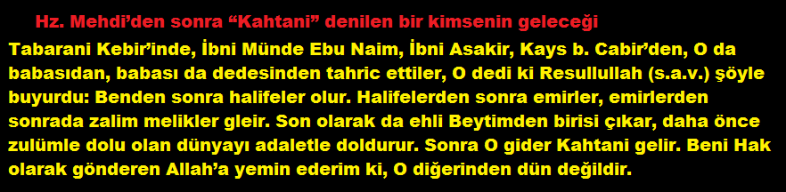 «Peygamber, şöyle buyurdu: Benden sonra Halîfe'ler gelecek. Halîfe'lerden sonra Emir'ler gelecek. Emirlerden sonra zorlu Melik'ler gelecek. Sonra ehl-i beytimden yeryüzünü zulüm yerine adâleti dolduracak bir adam çıkacak. Sonra, Kahtânî'nin iş başına getirilmesi emredilecek. Beni gerçekle gönderen Allah'a kasem ederim ki, O, ondan aşağı değildir.»