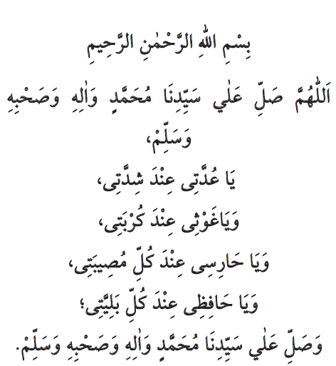 Ey sıkıntı anlarımda destekçim, Ey kederli anlarımda yardımcım, Ey her musîbette gözetip kollayanım, Ey her belâ anında koruyucum; Muhammed (s.a.v.) Efendimiz’in âline ve ashâbına salât ve selâm eyle.”